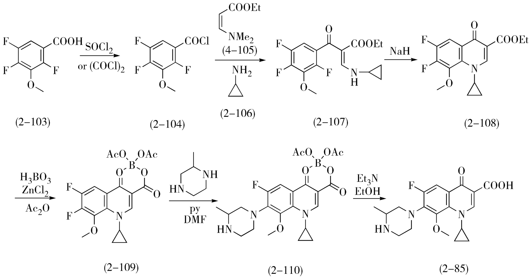 参照上述环丙沙星的合成方法,加替沙星(2-85)可以2,4,5-三氟-3-甲氧基苯甲酸(2-103)为起始原料,成酰氯后与3-二甲氨基丙烯酸乙酯(2-105)反应后,再用环丙胺(2-106)置换,取代关环后得到关键中间体(2-108)。这时若将2-108水解直接与2-甲基哌嗪缩合,由于8位甲氧基的强推电子作用,使得7位氟作为亲核取代反应的离去基团活性大大降低,故缩合收率仅为19.4%;因此将2-108先与硼化物反应生成络合物(2-109),由于4位羰基上氧原子的p电子向硼原子的空轨道发生转移,使得4位羰基的吸电子效应进一步增强,从而提高了7位氟对亲核试剂的反应活性,与2-甲基哌嗪缩合,然后水解得到加替沙星,按此路线改进后缩合与水解两步产率可提高到75.5%(图2-34)。