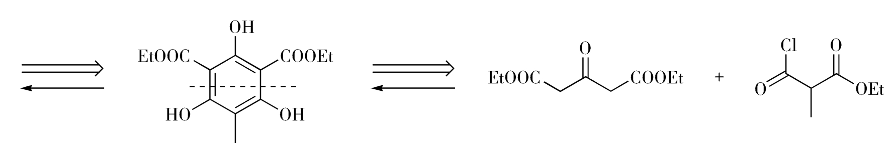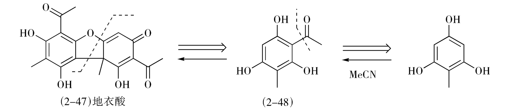 除草剂地衣酸(usnic acid,2-47)本身也无对称性,但可分拆为相同的两部分,即可由相同两片段(2-48)汇聚合成,这时的合成是左右对称的(这种情况被称为自反性),下面的工作就是合成的2-48了(图2-21)。