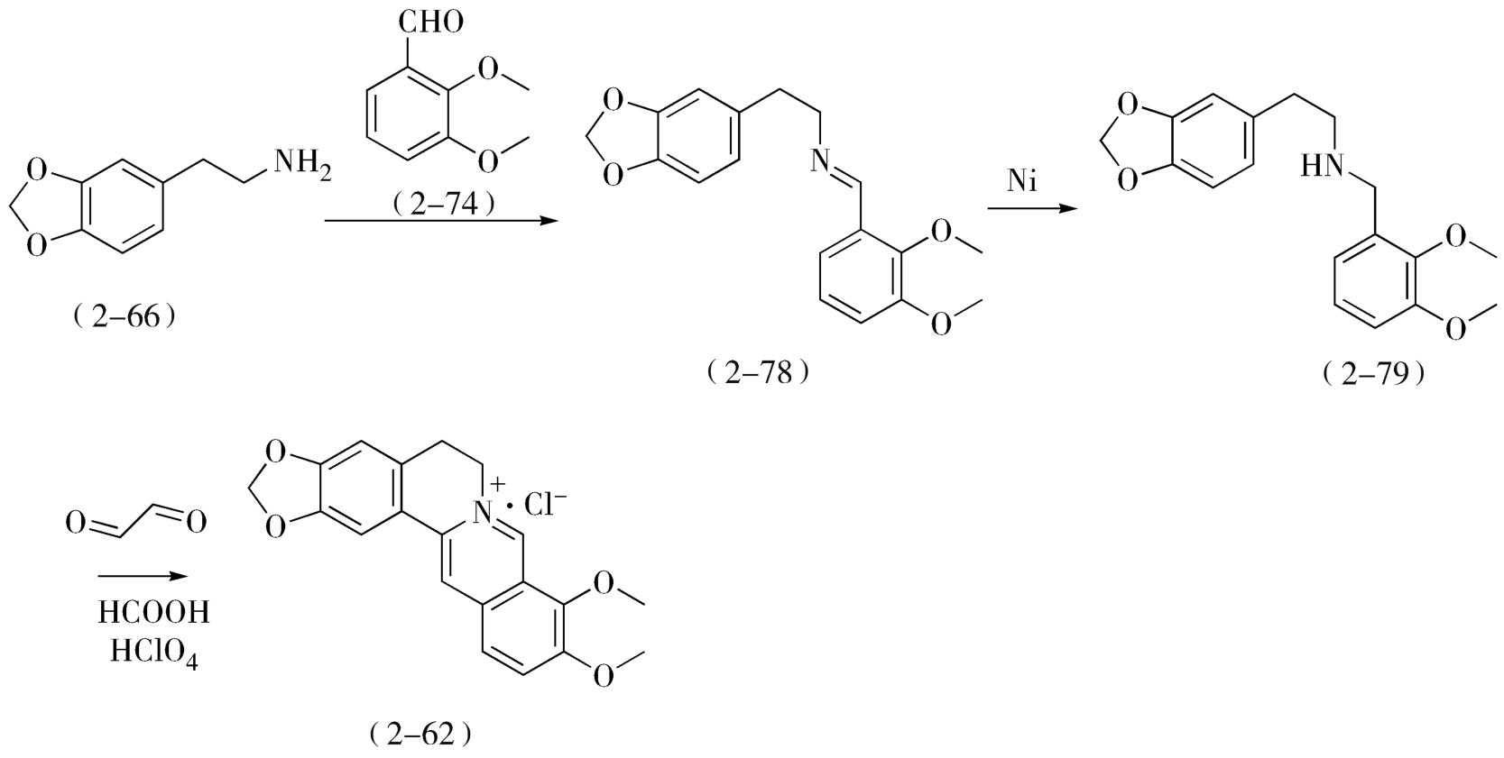 参照上述帕马丁的合成方法,从胡椒乙胺(2-66)与2,3-二甲氧基苯甲醛(2-74)出发,可快速合成小檗碱(2-62)(图2-28)。