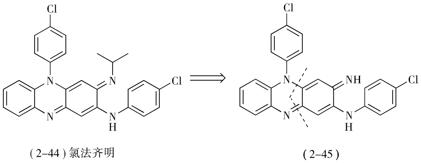 2.潜在对称性 目标药物分子的对称性,包括轴对称和面对称,都可用于简化合成设计,对于简单分子而言这一点是明显的。但有些药物分子本身并没有对称因素,只有经过一定的逆合成转化,才能得到一个对称的分子或一条对称的合成路线,从而简化合成设计,这叫作分子的潜在对称性(potentialmolecular symmetry)。例如,抗麻风药物氯法齐明(clofazimine,2-44)可看作吩嗪亚胺类化合物,即是2-对氯苯氨基-5-对氯苯基-3,5-二氢-3-亚胺基吩嗪(2-45)的衍生物,从2-45虚线处可看成两个对称分子(图2-19)。