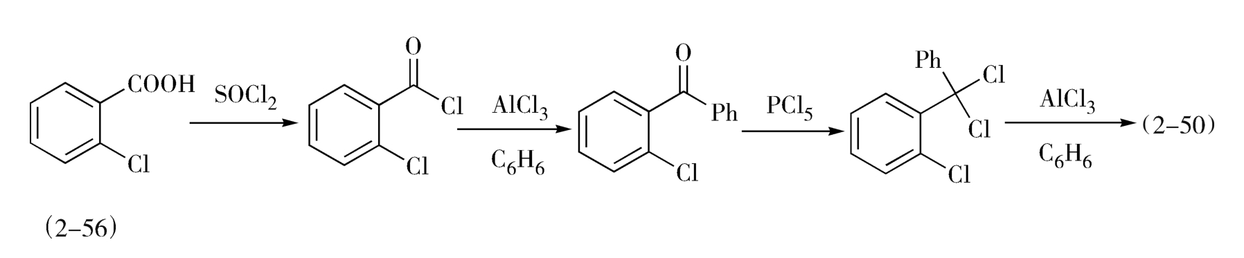 鉴于此,参考四氯化碳与苯通过Friedel-Crafts反应可生成三苯基氯甲烷(2-53)的类型反应,人们又设计了以邻氯苯基三氯甲烷(2-56)为关键中间体的合成路线。