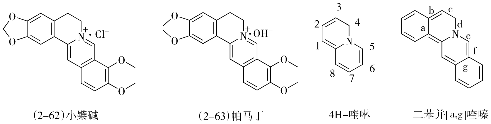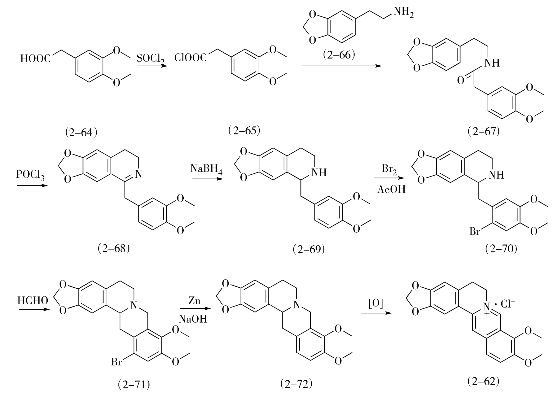 1.小檗碱的合成 中药黄连中的抗菌有效成分小檗碱(黄连素,berberine,2-62)与镇痛药帕马丁(palmatine,2-63)都是具有母核二苯并[a,g]喹嗪、含有稠合的异喹啉环结构的化合物。