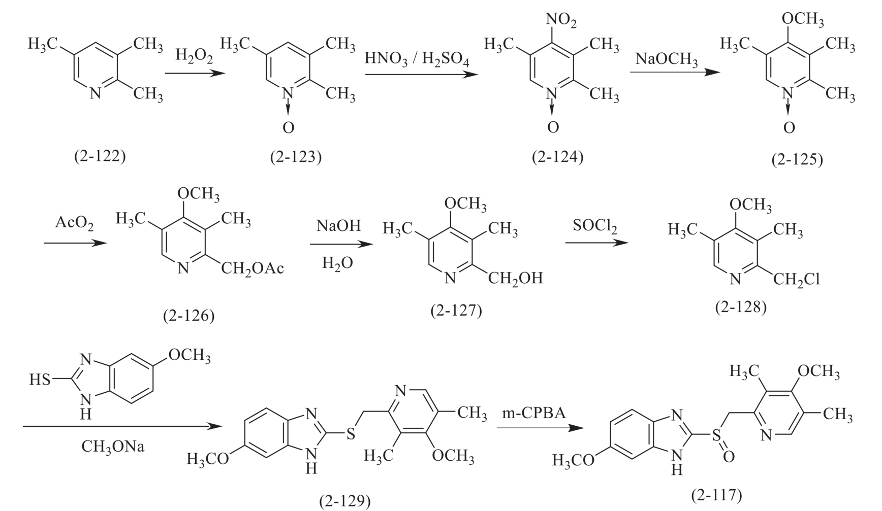 奥美拉唑的合成以2,3,5-三甲基吡啶(2-122)为原料,通过氧化、硝化、甲氧基化、在乙酐中重排、水解、氯化亚砜氯化,与2-巯基-5-甲氧基苯并咪唑在甲醇钠参与下缩合成硫醚,最后再经间氯过氧苯甲酸(m-CPBA)氧化制得(图2-36)。