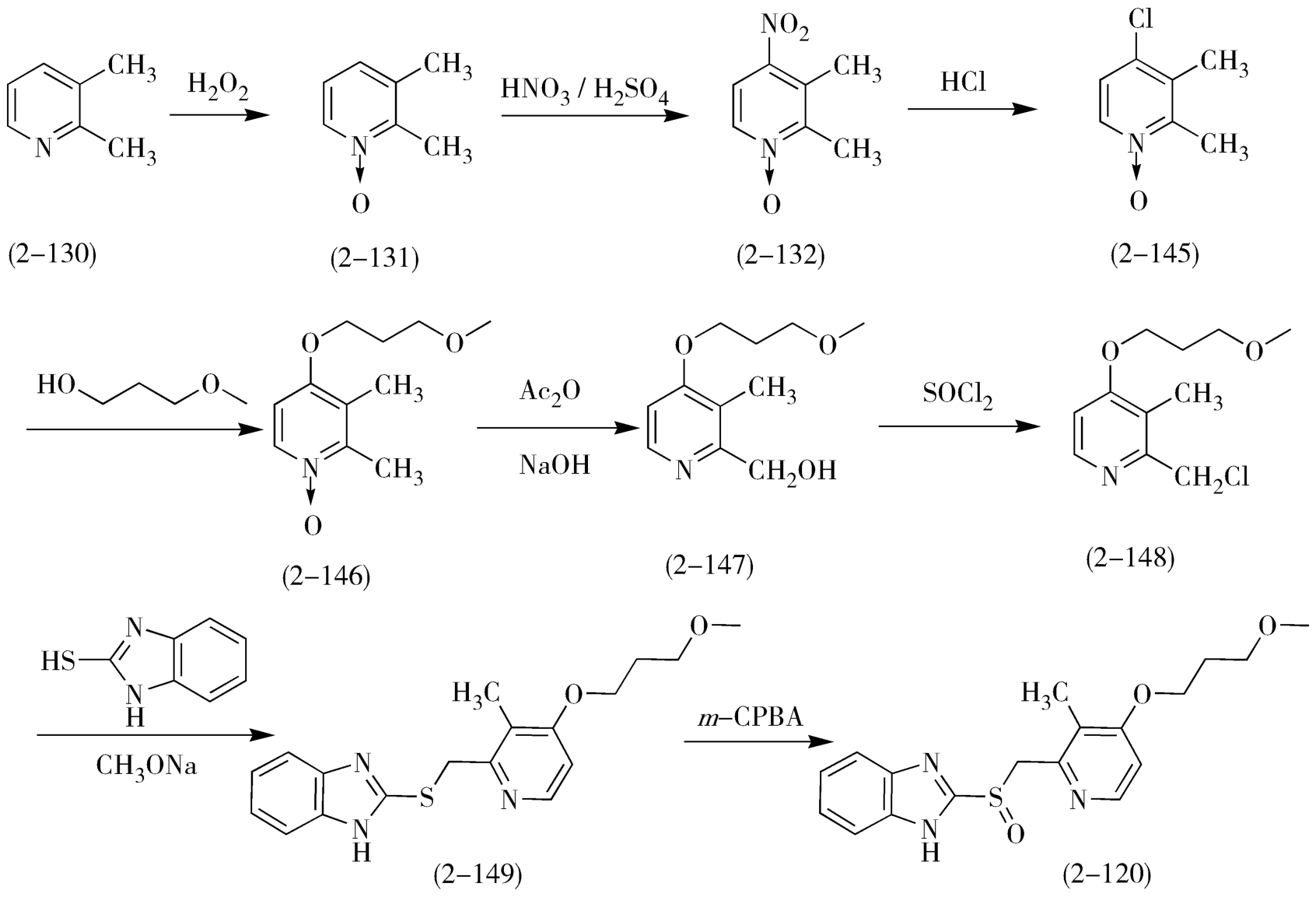 雷贝拉唑(rabeprazole,2-120)的合成原料与兰索拉唑相同,以2,3-二甲基吡啶(2-130)为原料,经过氧化、硝化、重排、水解、取代等反应,经过五个化合物的合成过渡,再与2-巯基-1 H -苯并咪唑缩合,制得关键中间体2-[4-(3-甲氧基丙氧基)-3-甲基-2-吡啶基]甲基硫-1 H -苯并咪唑(2-148),最终选择合适的氧化剂制得雷贝拉唑(图2-39)。