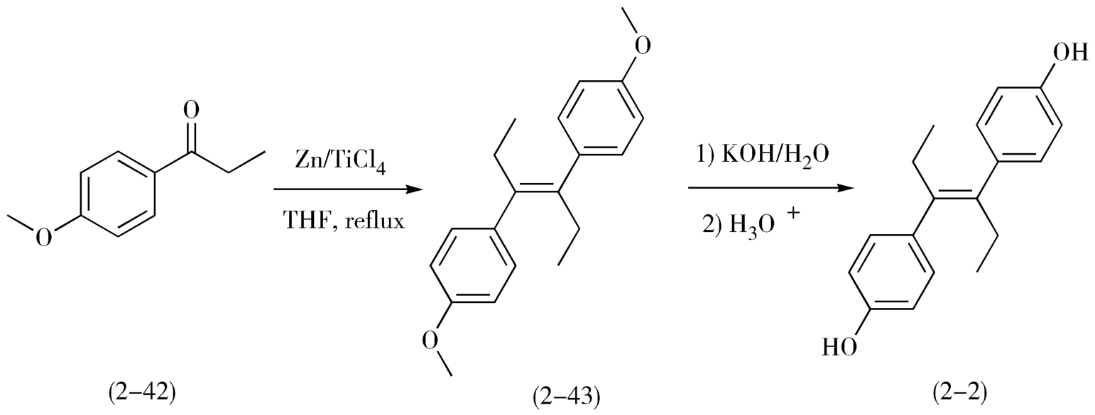 1.利用对称性合成己烯雌酚 如己烯雌酚(2-2)可以通过两分子的对甲氧基苯丙酮(2-42)在钛催化的情况下发生McMurry反应生成关键中间体(2-43),再经水解反应制得(图2-18)。