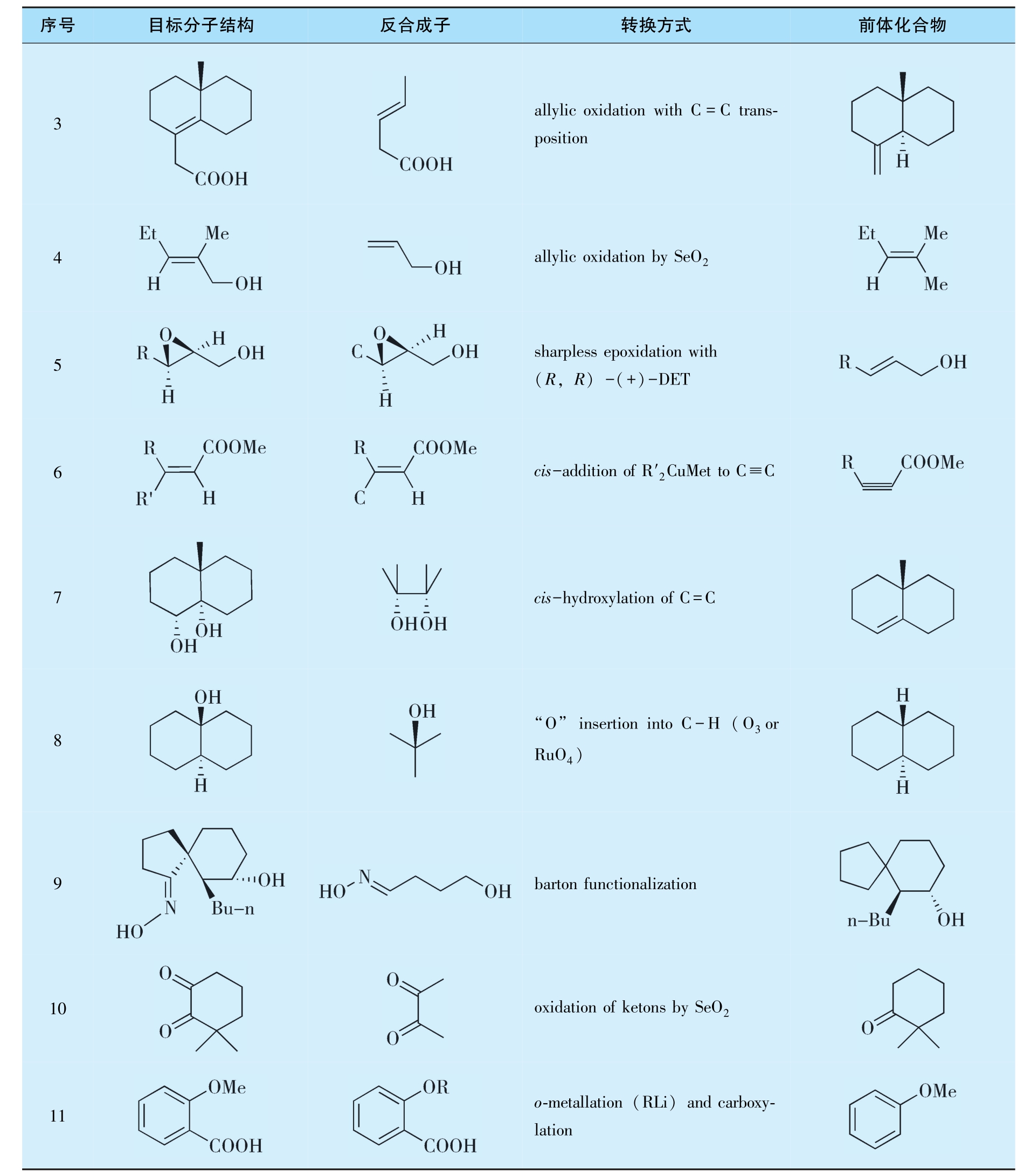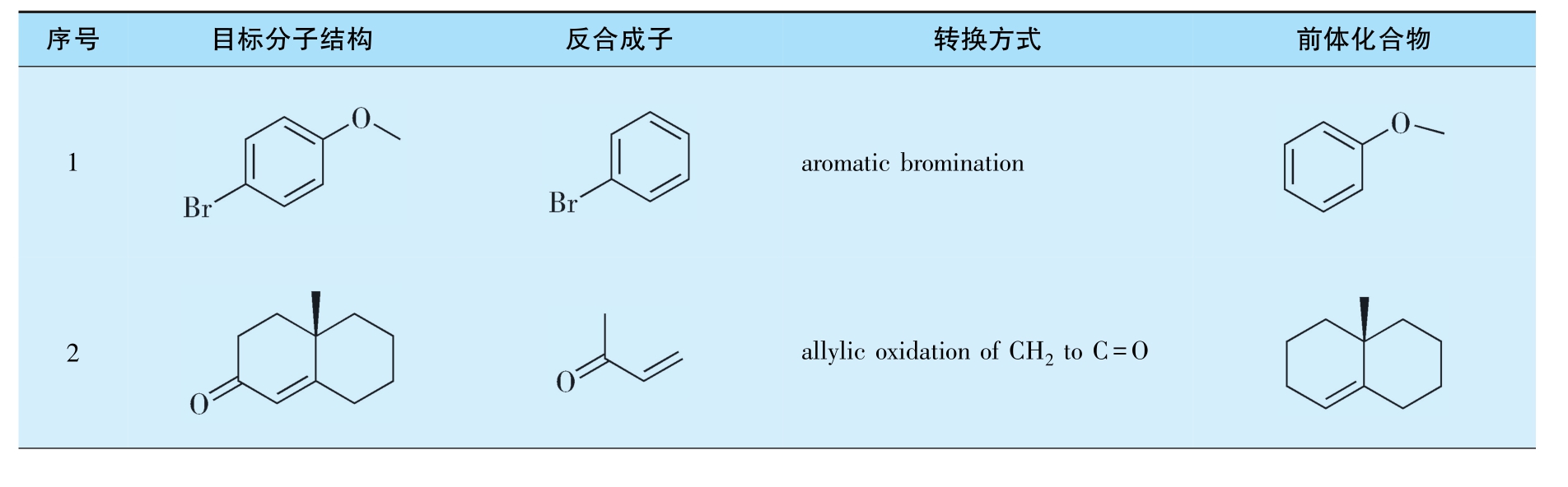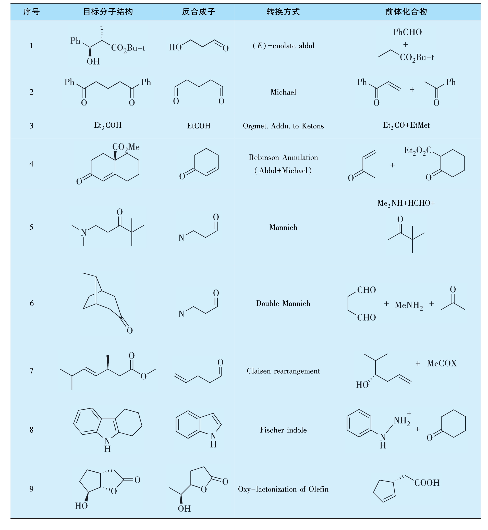 反合成子是针对合成子与反应中间体的混淆与乱用而提出的,与合成子考虑的内容不同:合成子是通过转化得到的,目标分子本身并不一定具有该结构(例如重排或联接得到的合成子),而反合成子则是指结构本身所具有的结构,通过该结构可相应地找到所需的转化类型,如表2-4和表2-5所示,两者的因果关系不同,或者说互为因果。