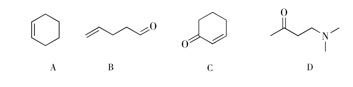 反合成子(retron)为进行某一转化所必须考虑的结构亚单位,即结构片段,由氢原子、官能团、分子链、分子骨架和立体中心等结构单元或单独或联合组成。如下列结构片段A、B、C、D分别为Diels-Alder反应、Claisen重排、Robinson关环和Mannich反应的反合成子。