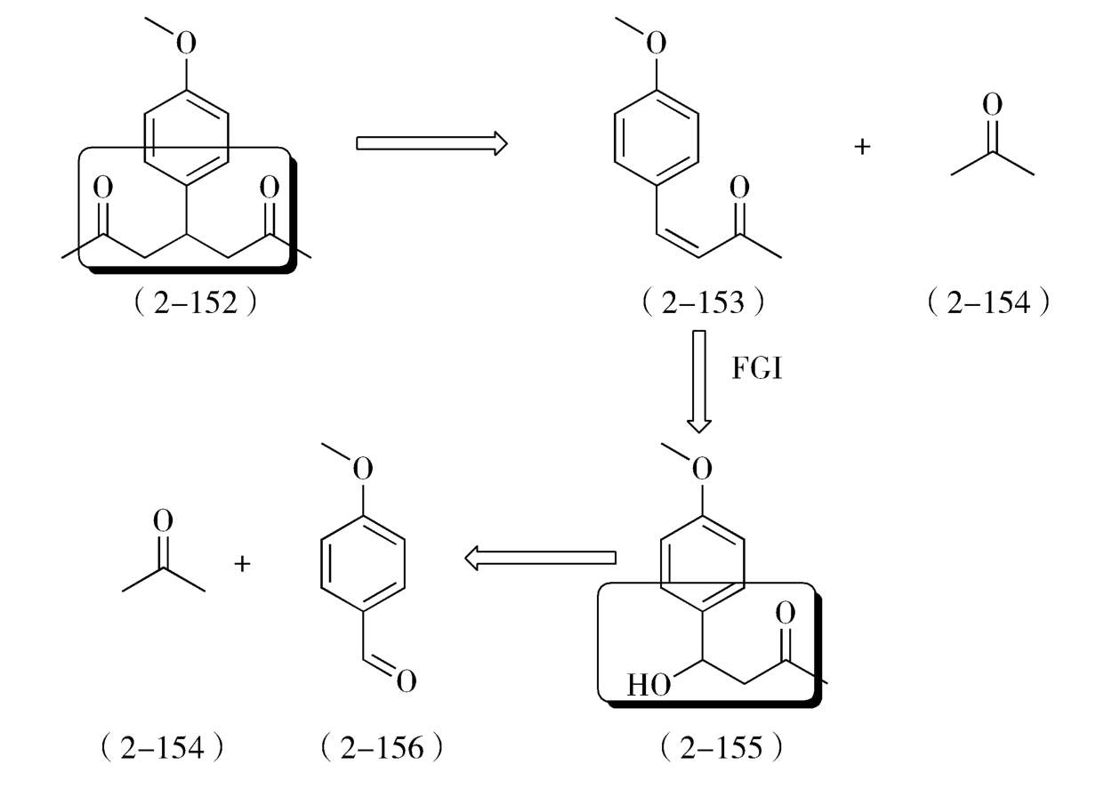 举例来说,4-(4-甲氧苯基)-2,6庚二酮(2-152)具有明显的1,5-二酮的结构特征(反合成子),从表2-4中可通过Michael加成方法完成转化。因此,尽管该分子具有明显的结构对称性,仍可以不做重要考虑,而通过α,β-不饱和酮(2-153)与丙酮(2-154)的Michael加成反应获得(图2-44)。