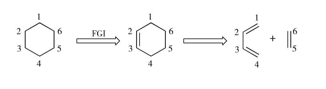 例如,目标分子中含有六元环结构,通常的目标转换方式为Diels-Alder反应和[2+4]加成反应: