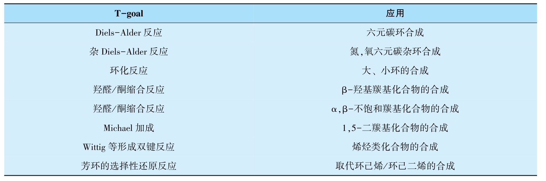在目标分子的合成中,常常会涉及许多不同类型的反应。其中一些反应用于构建分子骨架、立体中心或生成主要官能团。在目标分子的逆合成分析中,能够对目标分子起到简化作用的转换方式叫作“导向转换方式的反(逆)合成研究”(transform-guided retrosynthesis search)。对于特定目标分子,其逆合成分析可以是多步的,但每一步都需要有一个简化方式,这种简化方式称为“目标转换”(T-goal)。因此,研究转换方式策略的任务就是通过研究、比较、筛选,最终选择和确定T-goal,从而实现对目标分子的简化。表2-6列出了一些典型转换反应及其构建的结构单元。