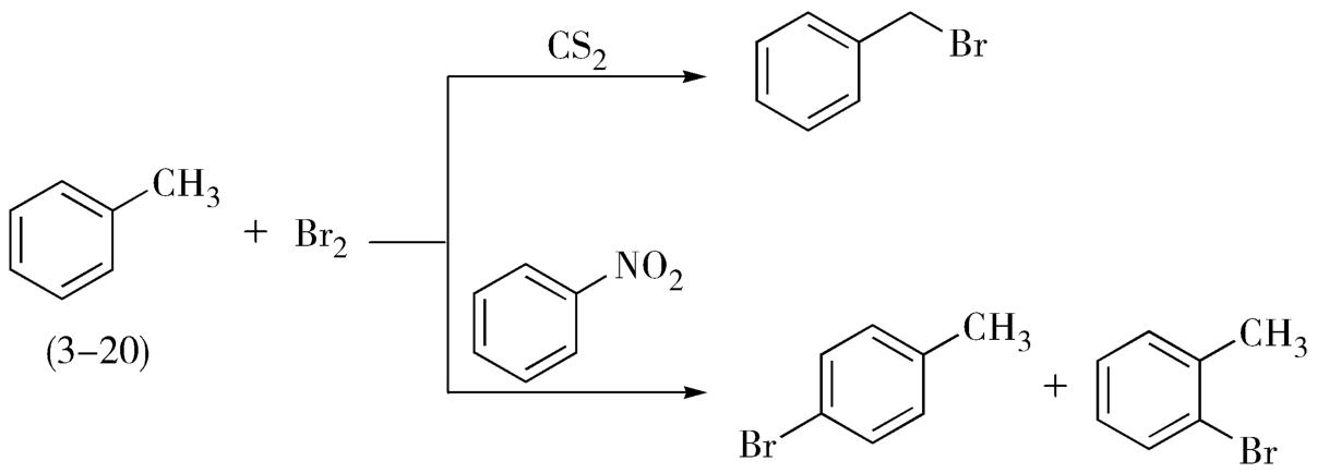 2.溶剂对化学反应方向的影响 溶剂除可影响化学反应速率外,还可影响化学反应的方向。例如,甲苯(3-20)与溴素进行溴代反应时,不同极性的溶剂决定了反应进行的方向,得到完全不同的取代反应产物。当以二硫化碳为溶剂时,取代反应发生在侧链上;当以硝基苯为溶剂时,取代反应发生在苯环上,如图3-13所示。