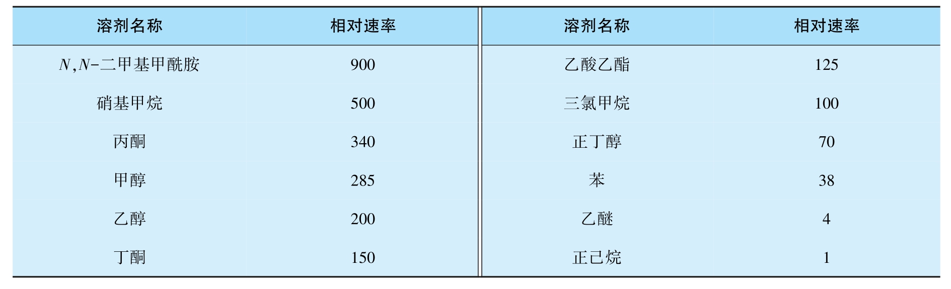 若以应用正己烷为溶剂时的反应速率为1,则应用其他溶剂时的相对反应速率如表3-1所示。可以看出,溶剂的极性增大,反应速率也加快,而极性的非质子性溶剂更有利于反应。