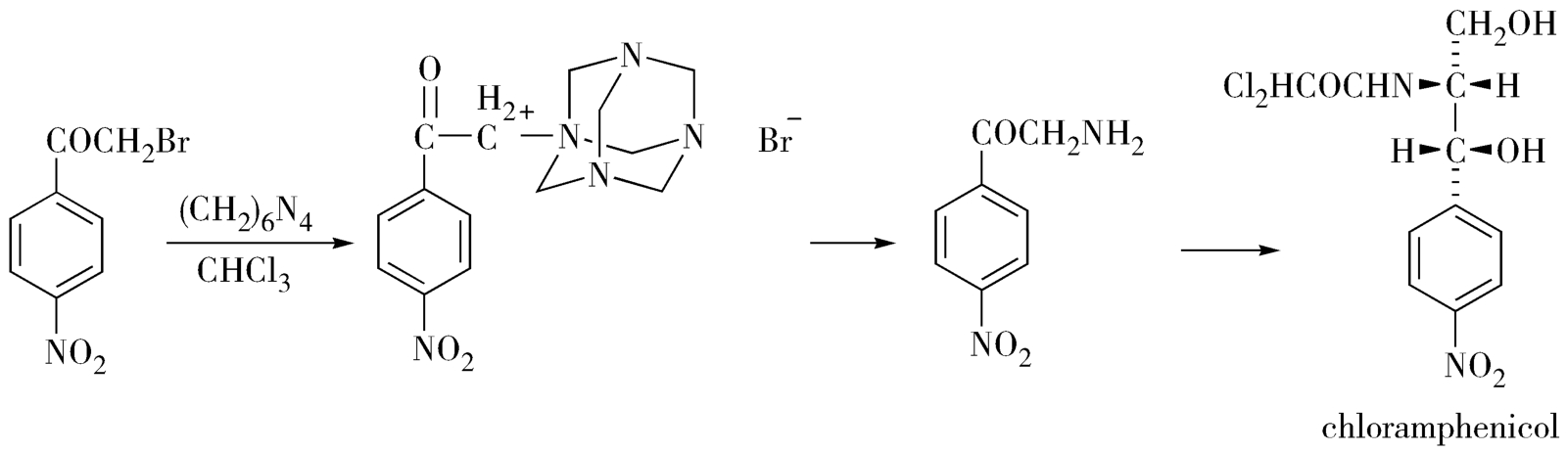 在氯霉素制备的胺化工艺中,卤代烃和乌洛托品先反应成盐,而后在乙醇中盐酸作用下水解得伯胺。成盐反应的反应物是卤代烃、产物是季铵盐,两者极性差别大,在三氯甲烷中反应物是可溶的,而产物可以结晶出来,通常不需要纯化(图3-19)。