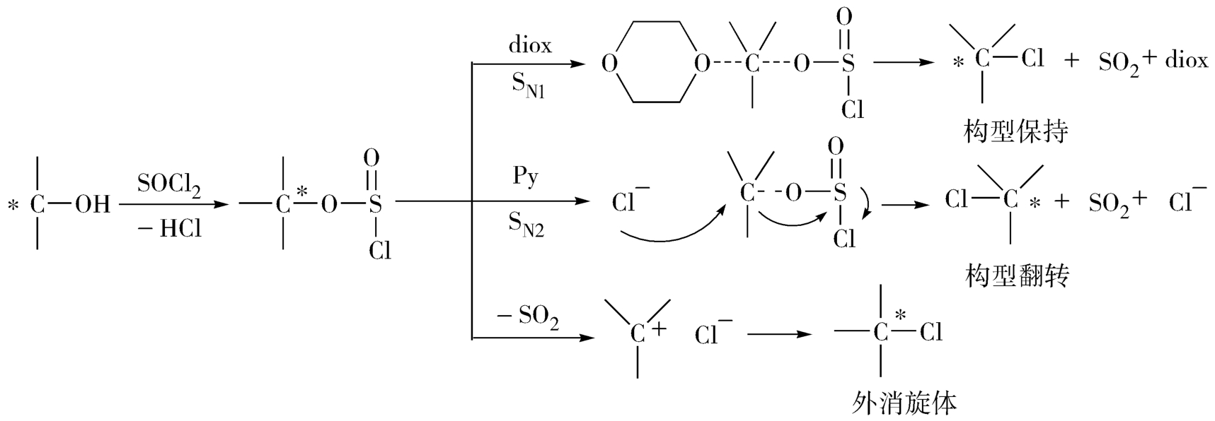 光学活性的2-正辛醇用氯化亚砜在不同溶剂中进行反应,得到不同构型的相应氯化物,若添加氯化锌为催化剂,反应速率明显加快,S N2 机理转化为S N1 机理,得到外消旋产物(图3-17)。