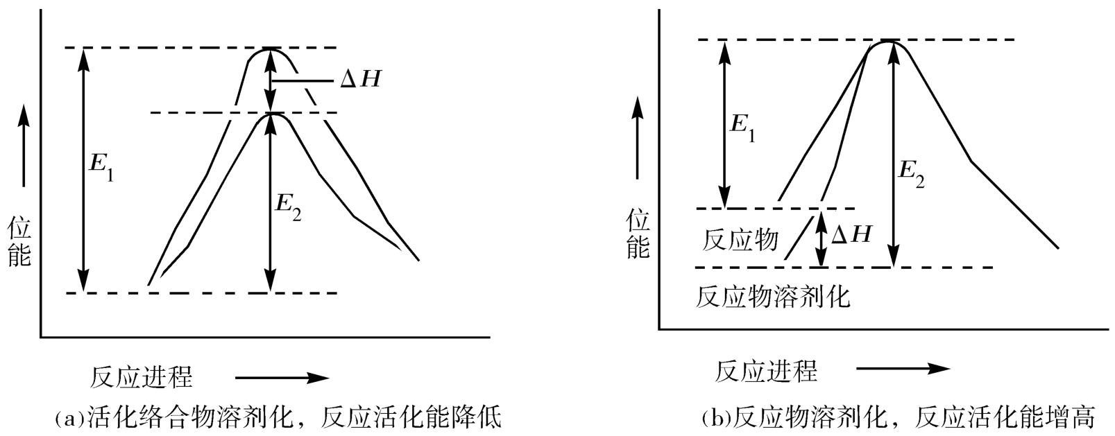 化学反应速率由反应物和过渡态之间的能量差(活化能 E )决定。化学反应中,如果反应物比过渡态更容易发生溶剂化,反应物位能降低Δ H 。相应地,活化自由焓增加Δ H ,降低了反应速率,见图3-11(a);当过渡态更容易发生溶剂化时,过渡态位能降低Δ H ,反应速率加快,溶剂极性加大对反应有利见图3-11(b)。
