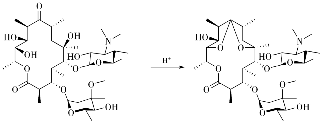 反应液的pH值对化学反应的结果有着较为重要的影响,也是药物合成工艺研究中不可缺少的内容。如制备红霉素二级降解产物红霉素A 6,9,12-螺缩酮的过程中,使用盐酸可以成功制得降解产物,而使用酸性较弱的醋酸时就得不到相应的降解产物(图3-20)。另外,某些化学反应需要在特定的pH值下才能发生,如当溶液pH值≤5时,任何浓度的甲酸溶液都难以发生银镜反应;而当9≤pH值≤12时,可产生较好的银白色致密银镜。