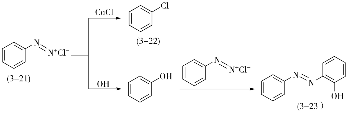 重氮基的取代反应是按照自由基的反应机理进行的,但该反应过程中可能有两个副反应发生。如图3-14所示,氯化重氮苯(3-21)发生取代反应时,在氯化亚铜的催化下可得到取代产物氯化苯(3-22),两个副产物分别为:按S N1 机理反应机理进行得到水解副产物——苯酚,以及按芳烃的亲电取代反应得到的偶合副产物——2-(苯基二氮烯基)苯酚(3-23)。其中,取代反应和水解反应都是在水中进行的,与有机溶剂的加入与否无关;但对于氯代反应和偶合反应的竞争,有机溶剂的加入有利于酚离开水相向有机相转移,相当于降低了酚的浓度,有利于氯代反应而不利于偶合反应,即在该类反应中,有机溶剂的加入会使反应更多地向着取代反应方向进行。