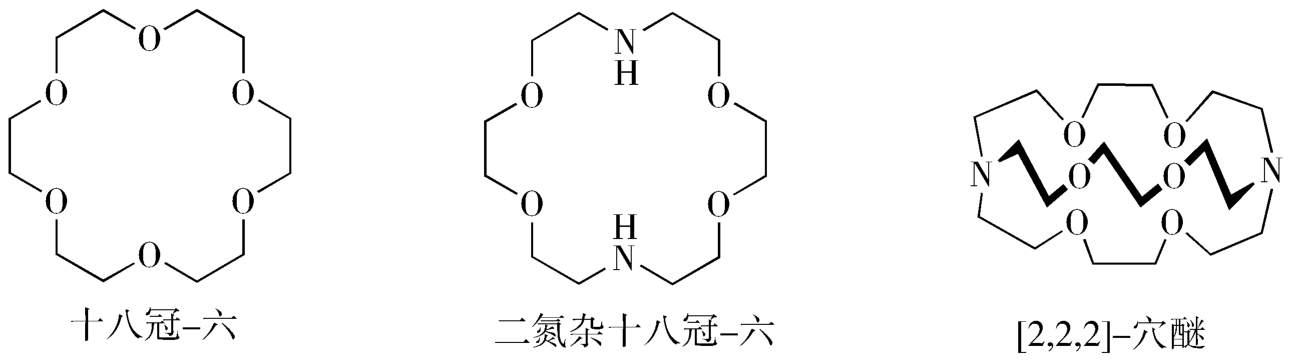 3.多环穴醚类 多环穴醚和冠醚相似,它的空穴能络合和包裹金属离子等,可用作相转移催化剂。多环穴醚的空间结构性强,比冠醚活性高,但制备困难、价格较贵。