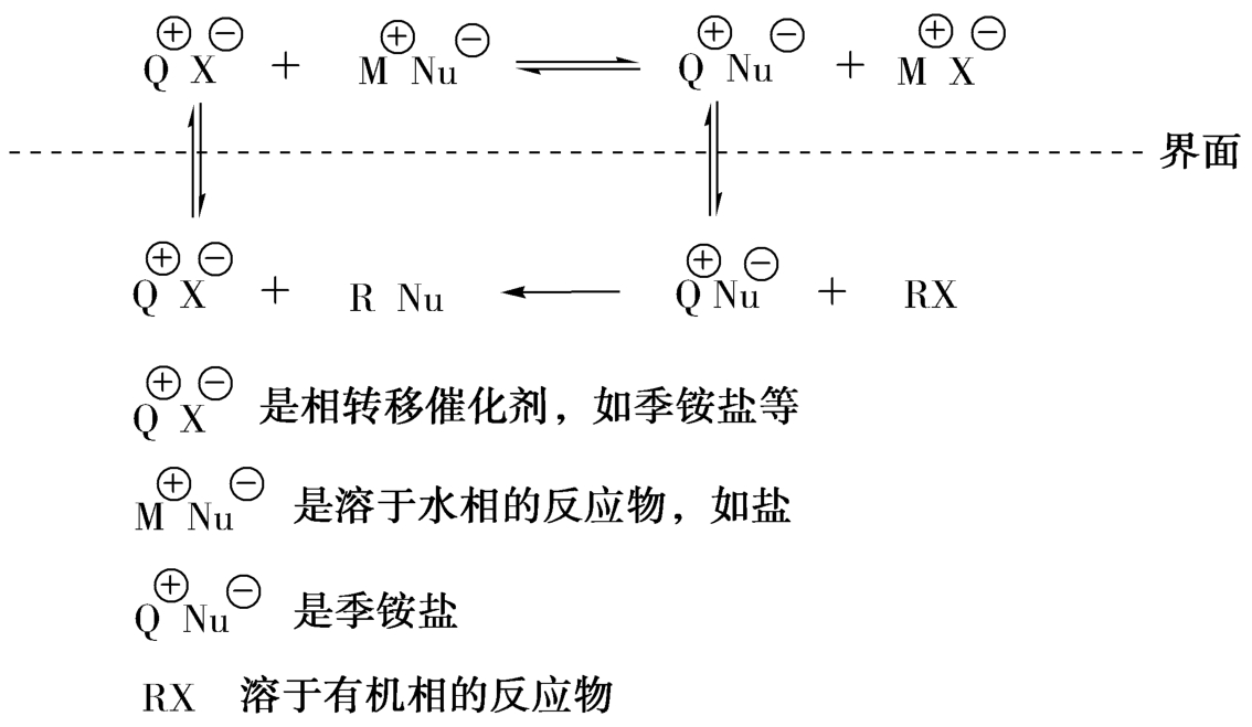 多数有机合成反应在均相条件下较容易进行,但在非均相条件下不容易进行,特别是在水和有机溶剂两相中,反应不完全或不发生反应。即使搅拌能增加相互接触的机会,但有些反应仍不能进行。为了促使其反应,往往采用极性溶剂,使其成为均相反应,但用质子性溶剂能使反应物产生溶剂化作用,影响其反应速率,这时要向反应体系中加入一种特殊催化剂,即相转移催化剂(phase transfer catalyzed reaction,PTC)。它是使一种反应物由一相转移到另一相中参加反应的物质,它促使一个可溶于有机溶剂的底物和另一个不溶于此溶剂的离子型试剂之间发生反应。此类反应统称为相转移催化反应(phase transfer catalyzed reaction,PTCR)。