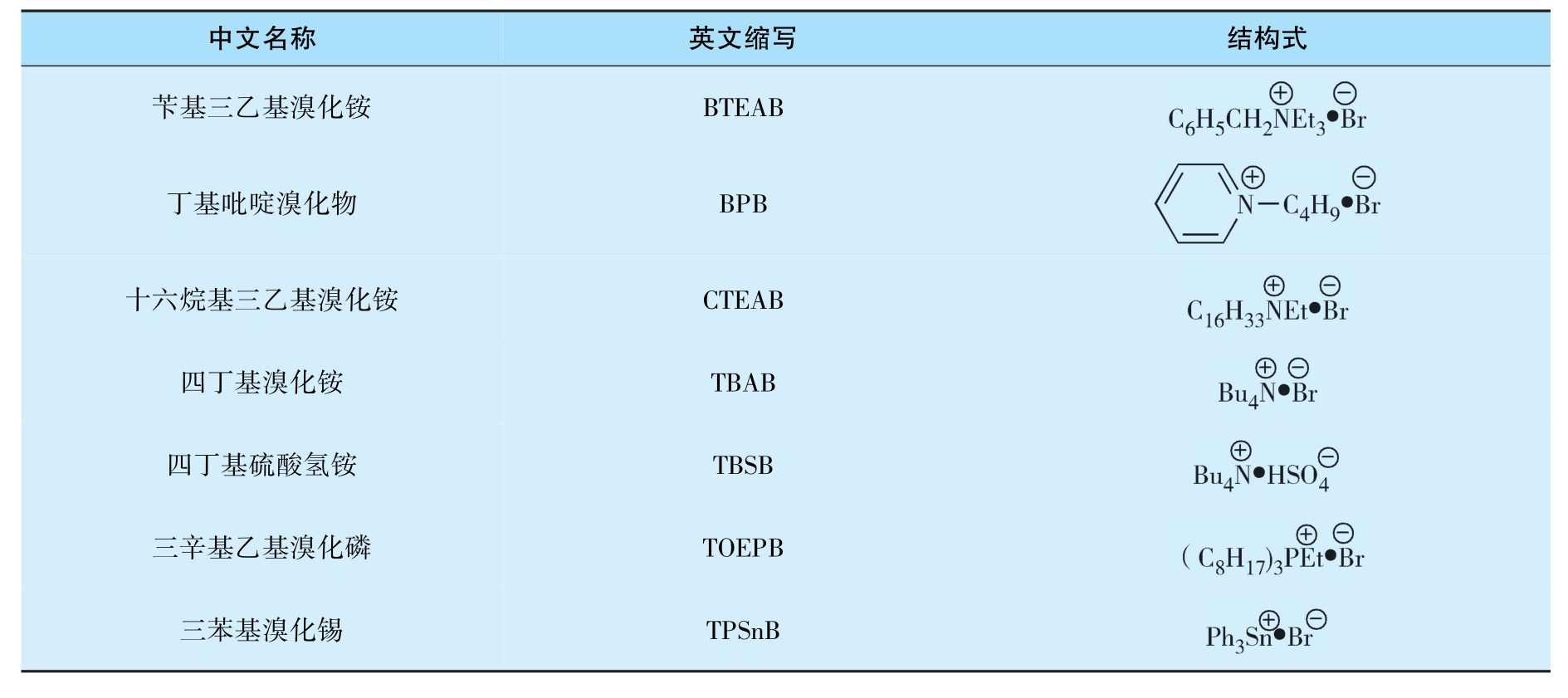 1.鎓盐类 此类催化剂主要由周期表中第五族元素组成,常用的有季铵盐、季鏻盐,还有季砷盐、季锑盐、季锡盐等,如表3-4所示。其结构特点是由中心原子、中心原子上的取代基和负离子三部分组成的,中心原子一般为P、N、As、S等。