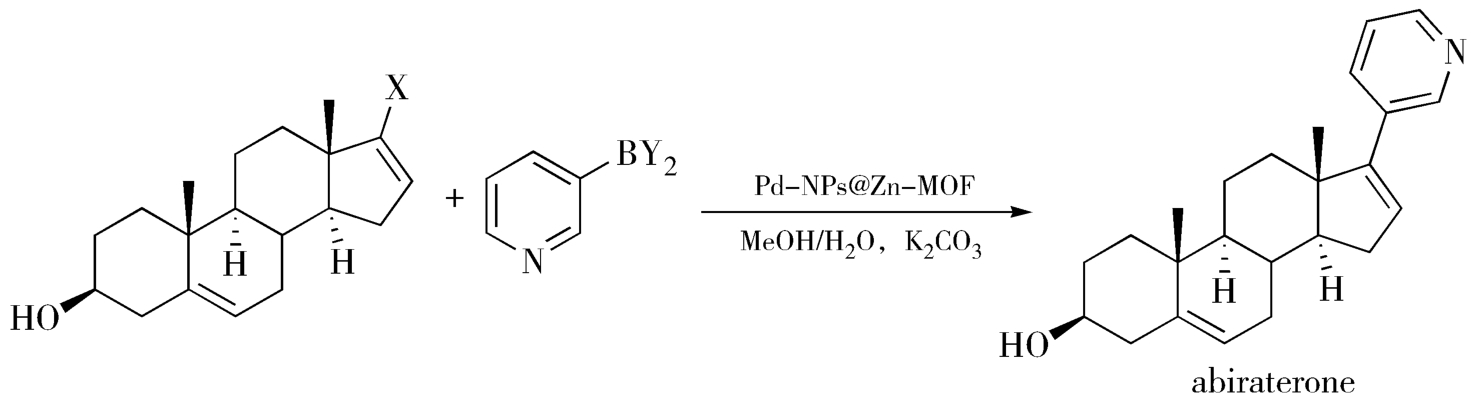 抗肿瘤药物阿比特龙(abiraterone)是一种靶向细胞色素CYP17抑制剂,其合成新工艺Suzuki-Miyaura偶联反应中使用了高效可重复使用催化剂Pd-NPs@Zn-MOF,如图3-29所示。