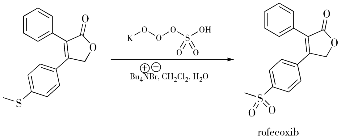鎓盐类相转移催化剂有如下特点:①分子量较大的鎓盐比分子量小的鎓盐催化效果好。②具有一个长碳链的季铵盐,其碳链越长,效果越好。③对称的季铵离子比具有一个长碳链的季铵离子的催化活性好。④含有芳基的铵盐不如烷基铵盐的催化效果好。该类相转移催化剂在化学合成中应用较多,如在抗炎药环氧化酶-2选择性抑制剂诺菲呋酮(rofecoxib)的合成工艺中,最后的氧化反应使用了四丁基溴化铵这一相转移催化剂使反应得以顺利进行,如图3-30所示。