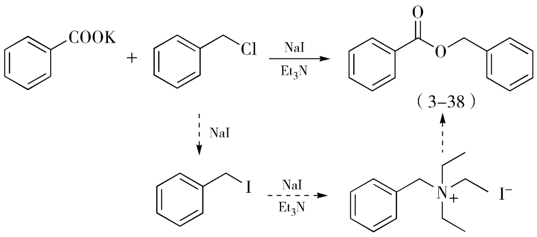 4.叔胺类 叔胺类是不带电荷的催化剂,它作为相转移催化剂时,首先转变为季铵盐,常用于烷基化反应、卡宾的形成、氰基化和硫氰化等反应,如苯甲酸苄酯(3-38)合成的过程中就应用了三乙胺作为相转移催化剂。