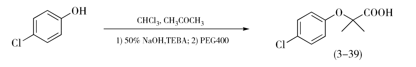 例如,对氯苯氧异丁酸(3-39)是在无水条件下,以固体氢氧化钠为催化剂,将对氯苯酚与丙酮、氯仿缩合而制得的,收率50%~75%。因固体氢氧化钠在丙酮中的溶解度小,需长时间搅拌才能溶解。用50%氢氧化钠溶液替代,则因催化能力降低,还会使氯仿水解。改变反应条件,以氯化三乙基苄基铵(TEBA)和PEG-400为相转移催化剂,采用相转移催化法合成,使对氯苯酚与丙酮和氯仿之间的反应在50%氢氧化钠溶液中进行,由于两种相转移催化剂起双重催化作用,其中TEBA催化二氯卡宾的生成,PEG-400用于催化醚化反应,可以得到高收率、高质量的产品(图3-32)。