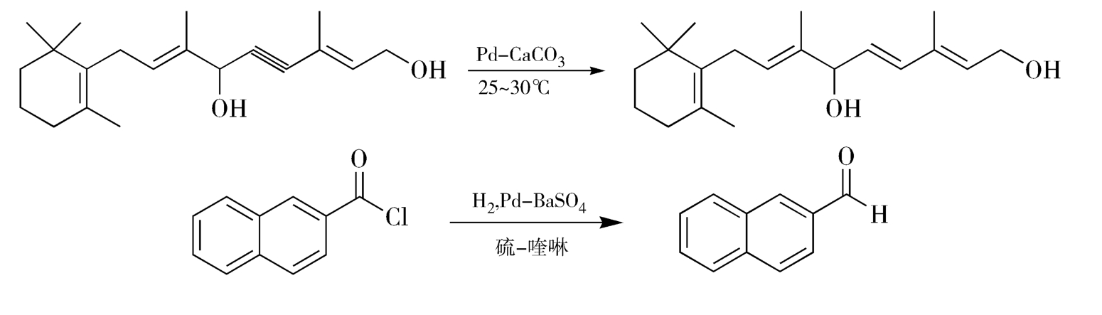 在Rosenmund反应中,应加有活性抑制剂(硫-喹啉)的钯催化剂或以硫酸钡为载体的钯催化剂,同时控制加的氢略过量,可使酰卤的还原反应停留在醛的阶段。