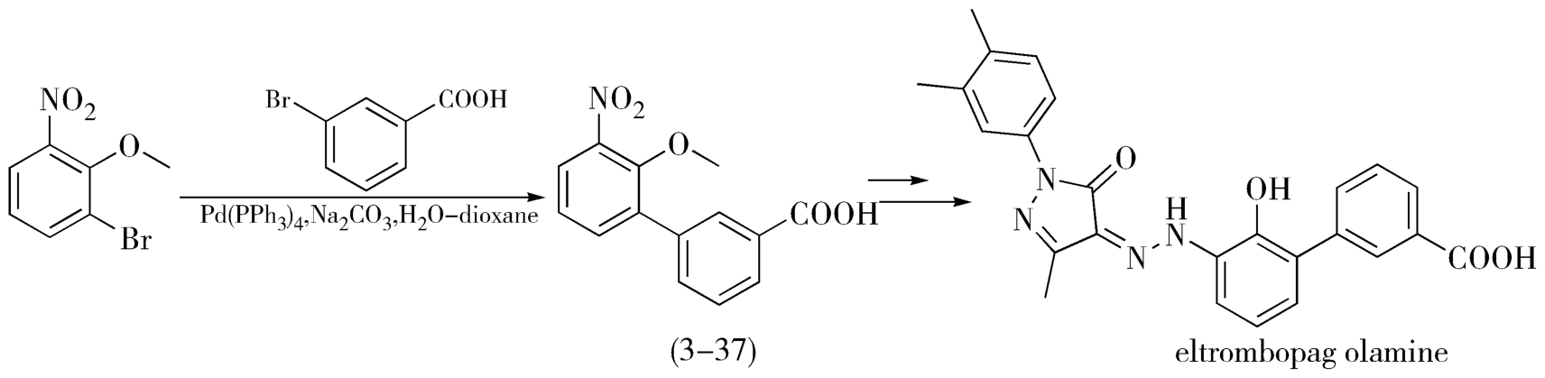 随着催化剂及化学学科的迅猛发展,除上述催化剂类型外,近来还出现了一些新型催化剂,如贵金属催化剂、稀土催化剂、纳米稀土催化剂等,它们已广泛应用于现代化学合成中。如2008年11月上市的治疗血小板减少性紫癜的新药艾曲波帕(eltrombopag olamine)合成工艺中中间体(3-37)的合成,就是使用贵金属催化剂四(三苯基膦)钯通过Suziki偶联制得的,如图3-28所示。