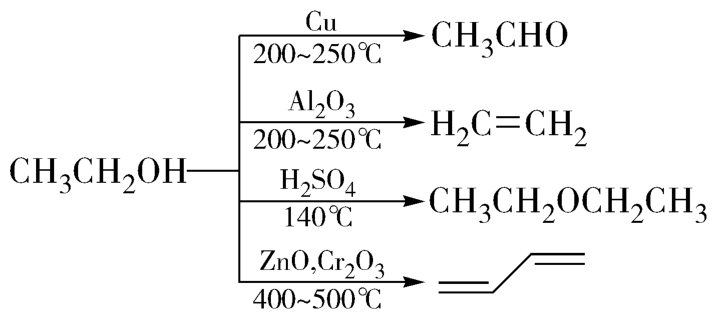 2.催化剂具有一定的选择性 该选择性主要体现在两个方面:①不同类型的化学反应有不同种类的催化剂,如铂、钯、镍等催化剂适用于催化加氢反应;五氧化二钒、二氧化锰、三氧化钼等适用于氧化反应。②对于同样的反应系统,应用不同的催化剂,可以获得不同的产物。例如,以乙醇为原料,在不同的催化剂和温度下,可以得到多种不同的产物。