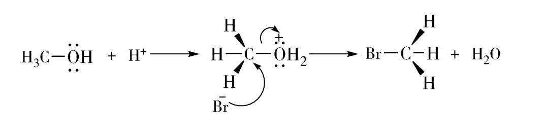 如将甲醇与溴化钠放在一起,它们之间不会顺利地发生亲核取代反应,当加入适量的硫酸后,溴离子就能取代醇中的羟基,生成溴甲烷。这是因为甲醇中的碳氧键结合得很牢固,要断裂它需要很高的能量。加入硫酸后,醇中的氧原子上的孤对电子与质子结合,电子发生转移,使氧原子上的电荷密度降低,增强了氧原子对碳原子上电子的吸引,使碳原子的电荷密度降低,有利于Br - 的进攻,降低了活化能,催化了反应的进行。