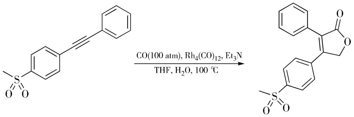 二芳基呋喃酮是诺菲呋酮合成工艺中重要的中间体,它的合成方法较多,其中以二芳基炔为原料,在金属催化剂及高压条件下即可选择性地一步制得,且收率较高。
