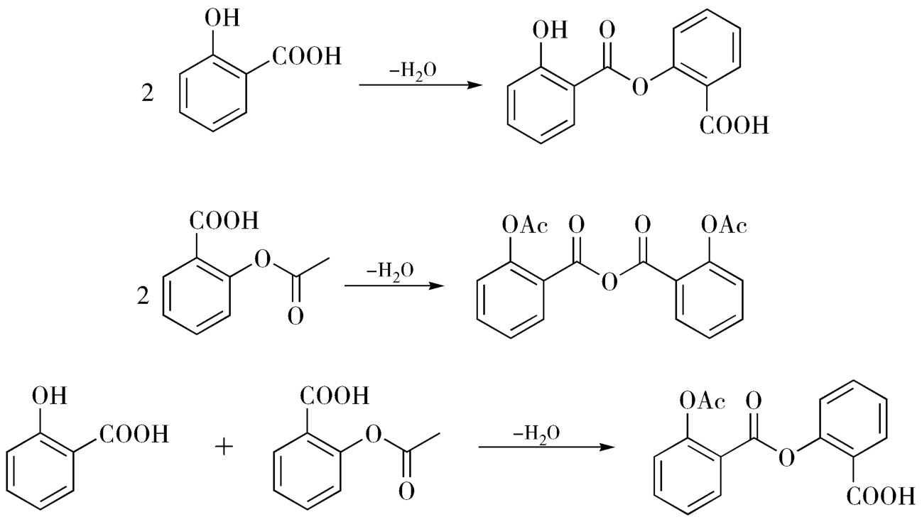 在乙酰化反应过程中,温度升高,可使主反应乙酰化的反应速率加快,而副反应脱水的速率也相应地加快。要使乙酰化反应完全,也要同时考虑到副反应的发生。因此,在工业生产中必须要严格控制反应温度,可先将温度缓慢升至73℃,然后在73~75℃反应数小时,反应完毕后再缓慢降温。只有这样,产品中的游离水杨酸和脱水副产物才能同时达到限量要求。