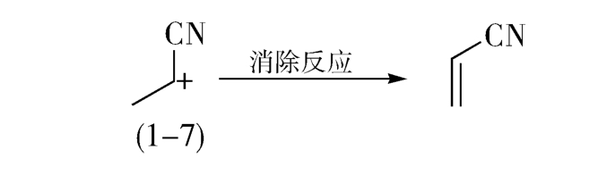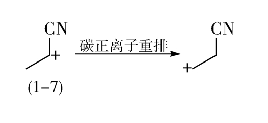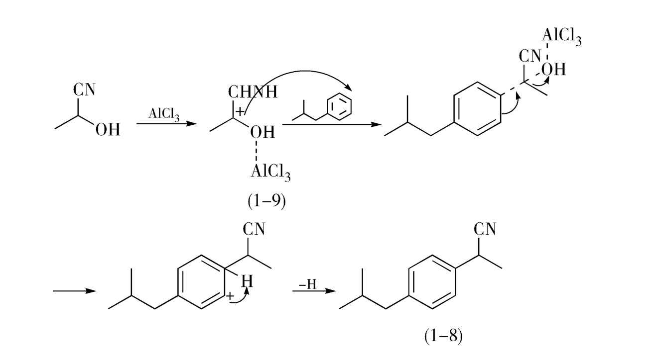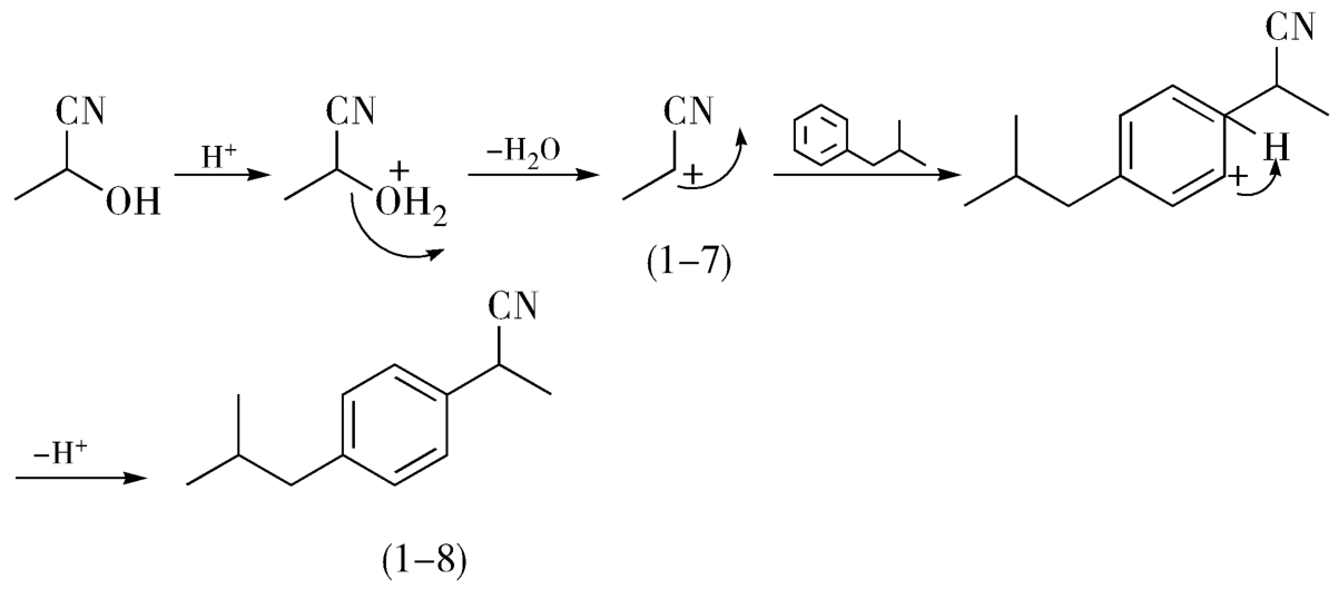 布洛芬中间体2-羟基丙腈是一个极为廉价的合成砌块,对异丁基苯发生烷基化反应可直接引入异丙腈结构(1-8),再进行水解就可以高收率制得布洛芬。这个烷基化反应由于邻位的空间位阻,也将高选择性地发生在对位。如果设计烷基化反应时使用酸作为催化剂,则首先产生的是碳正离子(1-7),在这个单分子历程中,(1-7)不可避免会发生重排与消除反应,使反应产物十分复杂。