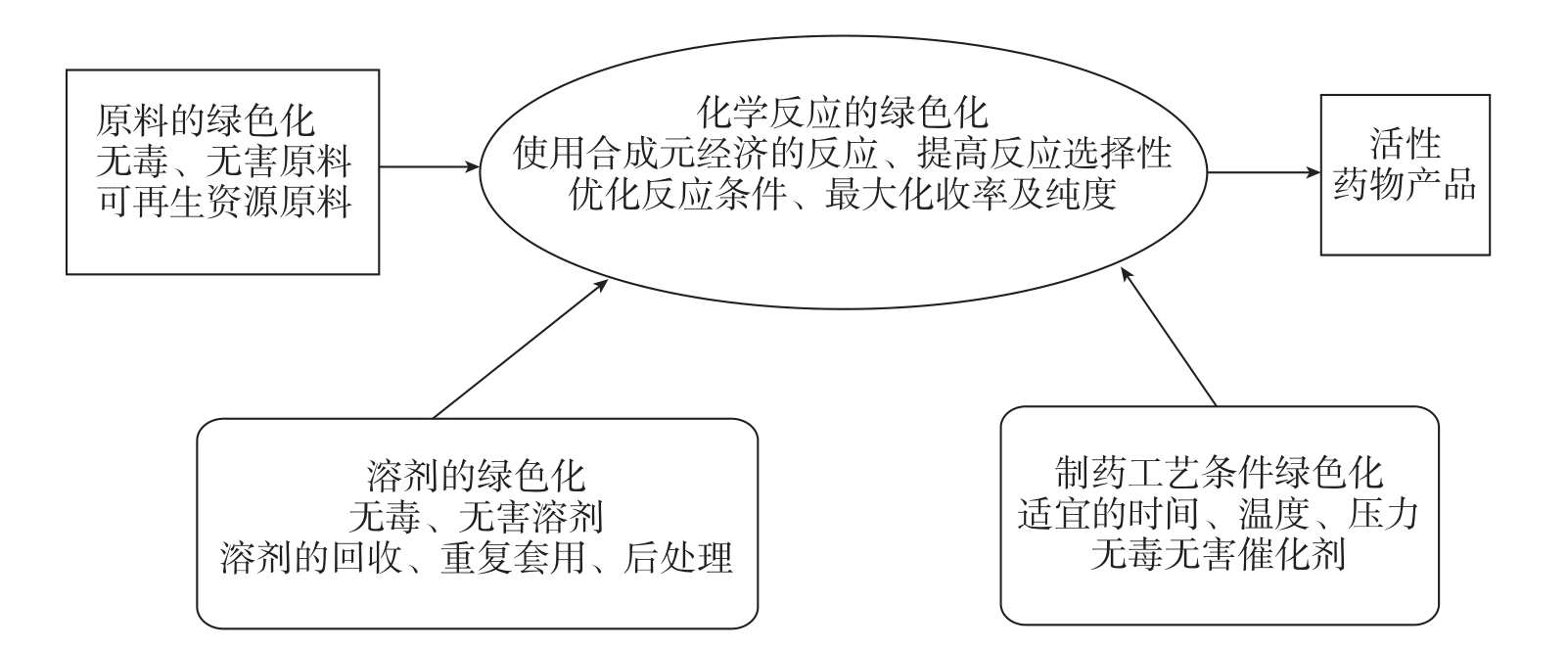 绿色制药工艺是以研究和发展生产药物活性成分、原料药为目标,通过发展高效、合理、无污染的绿色化学,推行清洁生产达成的;以环境和谐、发展经济为目标,创造出环境友好的先进生产工艺技术,实现制药工业的“生态”循环和“环境友善”及清洁生产的“绿色”结果。概括而言,现代制药工艺的绿色化,研究范围主要围绕原料、化学反应条件筛选、催化过程、溶剂使用、分离纯化和产品的绿色化来展开的,如图1-5所示。