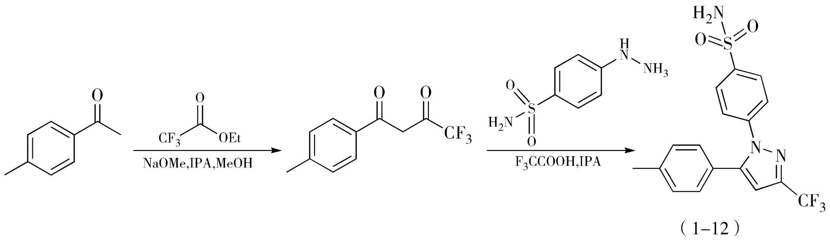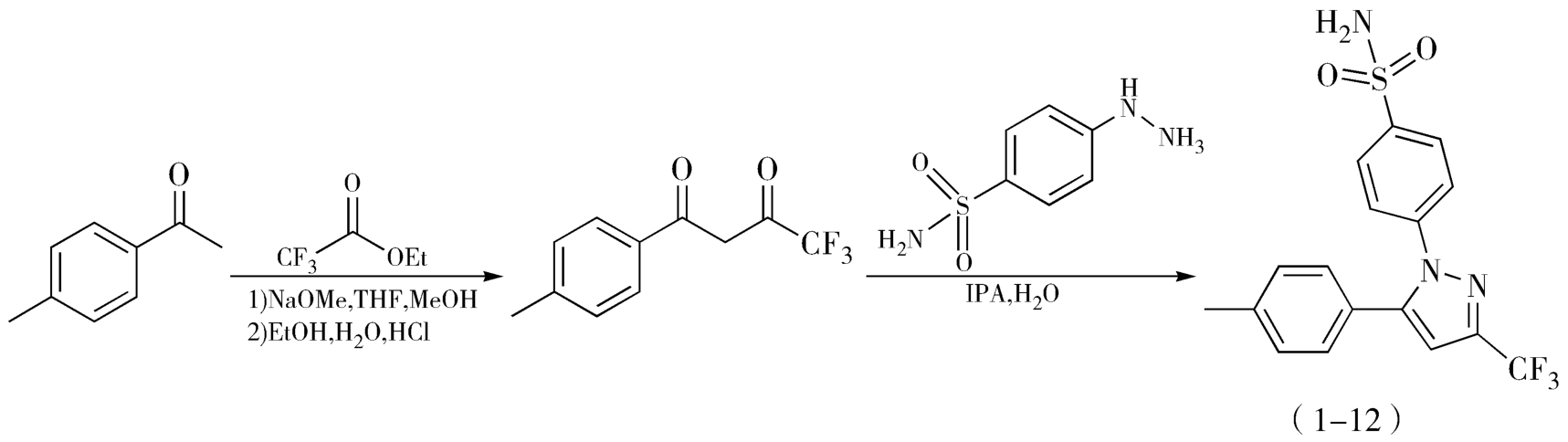 研究发现,在制备原料药的过程中,产生的废料大多与溶剂有关(30%水或60%有机溶剂)。因此,工艺上对溶剂的选择、使用及后处理对药品生产、环境保护极为重要。在原料药的合成中,溶剂除了使化合物有效地在液相中均匀反应外,还会进一步影响其粒径,导致分离难度增加或需要研磨而使成本上升;溶剂还常常会影响到原料药的晶型,继而影响到溶解度、制剂的溶出度及生物利用度。此外,溶剂的使用还会造成原料药中溶剂残留问题。如果残留溶剂不能有效除去,它们必须被控制至一定水平而不致于影响到患者的安全。例如,生产关节炎治疗药塞来昔布(1-12)的工艺中,共使用了5种常用溶剂(THF,MeOH,EtOH,IPA,H 2 O),如图1-6所示。在随后的工艺优化中,溶剂的数量从5种减少到3种(MeOH,IPA,H 2 O),如图1-7所示,溶剂的用量也大幅降低,总收率从63%上升到84%,产生的废物减少了35%,分离纯化时采用50%的异丙醇洗涤而不是原来100%的异丙醇,产品的分离只需冷却到20℃而不是原来的5℃,区域异构体杂质也减少到0.5%以下,为后续的精制工艺打下了很好的基础。