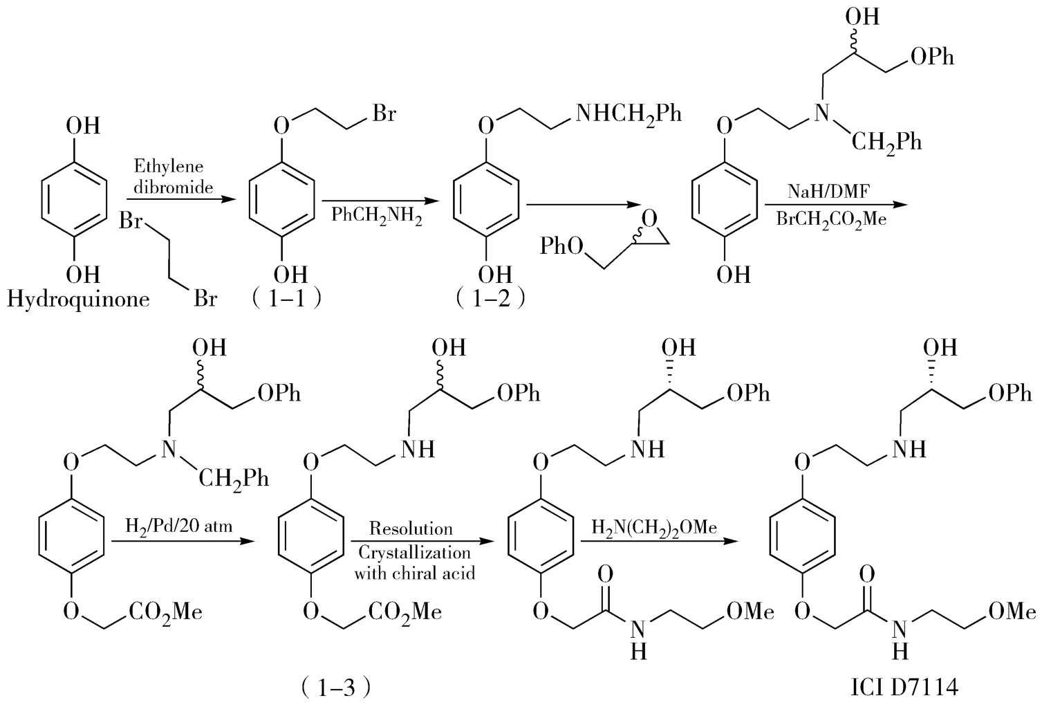 经过研究,将制备工艺路线改为如图1-4所示,它克服了这些问题,产率提高到33%。为了避免任何生成二烷烃化副产物的可能性,用对苄氧基苯酚作为起始原料,用乙二醚代替致癌的二溴乙烷,结果不再生产副产物乙烯溴化物。烷烃化产物(1-4)不需分离,直接与苄胺反应,因此减少了反应操作。苄醚的氢解在甲磺酸的条件下进行,后者可以阻止 N -苯苄基的氢解,得到结构(1-2),它是原合成路线中的一个中间体。烷基化得到结构(1-5)和不对称反应用环氧化物进行,这样可避免拆分问题。来自反应物(1-6)的产物可以氢化得到最终产物,而不需要分离(1-6),又一次缩短了反应操作。