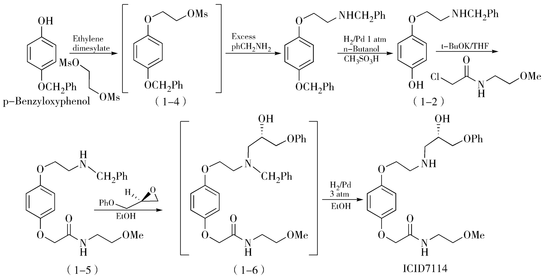 ICID7114是一种作用于肾上腺素β 3 受体激动剂,开发用来治疗肥胖症和非胰岛素依赖性的糖尿病,原来在研究实验室使用的制备工艺路线如图1-3所示。