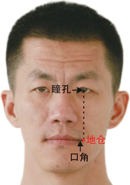 坐位或仰卧位点穴,以口角和瞳孔为定位标志。点穴时需保持目正视,使瞳孔的位置居于眼睛正中间。瞳孔直下的垂线与口角的水平线交点即为本穴。(图5-5)