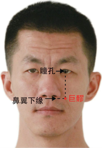 端坐正视,瞳孔直下与平鼻翼下缘水平线之交点即为巨髎穴,巨髎穴与瞳孔间的中点即是本穴。(图5-3)