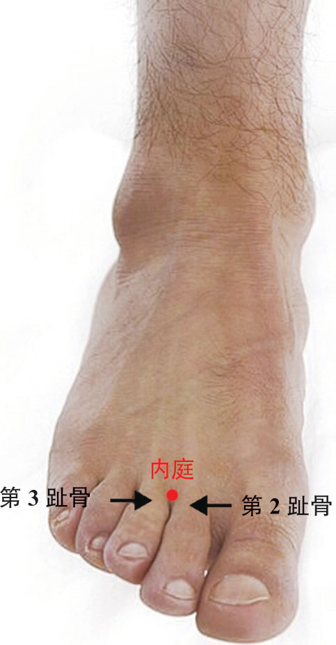 正坐或仰卧位点穴,以第2、3趾间趾蹼缘为定位标志。穴在第2、3趾蹼缘后方的赤白肉际处,如此处皮肤颜色难以分辨,以皮肤纹理分辨,两侧的皮肤纹理明显不同,穴在皮肤纹理变化分界处。(图5-53)