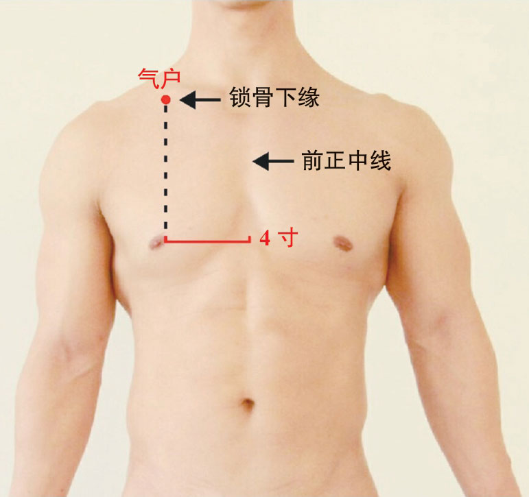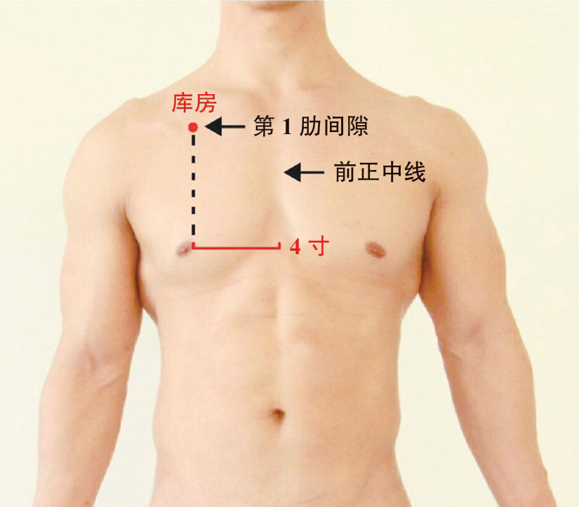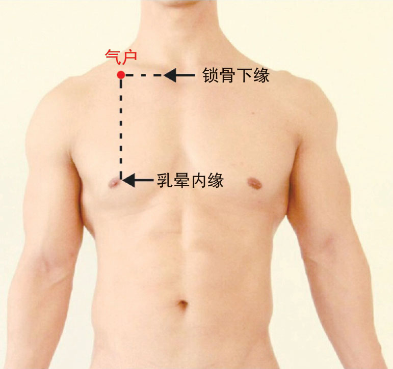 正坐或仰卧位点穴,以第1肋间隙和前正中线为定位标志。第1肋间隙为第1肋骨与第2肋骨之间的间隙,触之凹陷。第1肋骨位于锁骨后面,在锁骨上大窝内可触及。此处4寸以前正中线到乳晕内缘的横寸值为量取标准。先将前正中线至乳晕内缘之4寸自前正中线沿第1肋间隙平移,终点即为本穴。(图5-20)