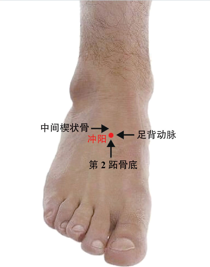 正坐或仰卧位点穴,以第2跖骨底、中间楔状骨和足背动脉为定位标志。当足尖向下用力跖屈时,足背明显隆起,穴在足背最高处。第2跖骨后端略膨大呈楔形,称为跖骨底,与中间楔状骨相接,穴在两骨相连接处,此处可触及搏动的足背动脉。(图5-51)