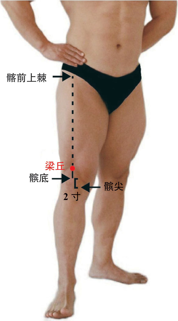 坐位或仰卧位点穴,以髌底与髂前上棘为定位标志。髂嵴的前端为髂前上棘,仰卧位时,下肢平伸或下肢搭于床沿外下垂,可见腹股沟外侧高高隆起的骨性突起,即为髂前上棘,易于触及。髌骨为膝关节前方皮下三角形的扁平骨,屈伸膝关节时随之移动,底朝上为髌底。从髂前上棘高点至髌底外侧端划一连线,穴在该线上。此处2寸以髌底到髌尖的直寸值为量取标准。将髌底至髌尖的2寸自髌底外侧端沿髂前上棘与髌底外侧端连线上移,终点即为本穴。(图5-41)