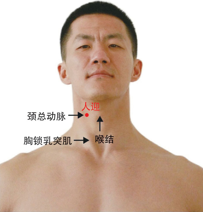 正坐仰靠位或仰卧位点穴,以喉结、胸锁乳突肌、颈总动脉为定位标志。喉结为咽喉部明显的软骨凸起,男子的喉结大而突出,易于辨识,女子的喉结小而隐蔽。将指腹放在颈部中间,可触摸到随吞咽动作上下活动的喉结。胸锁乳突肌位于颈部两侧皮下,是颈部诸多肌肉中最大、最粗的一条,当头稍低向一侧转动时,对侧胸锁乳突肌即明显隆起,穴在胸锁乳突肌前缘。颈总动脉位的体表投影是从胸锁关节的中点到下颌角至乳突连线的中点之间的连线,在胸锁乳突肌的前缘易于触及。(图5-13)