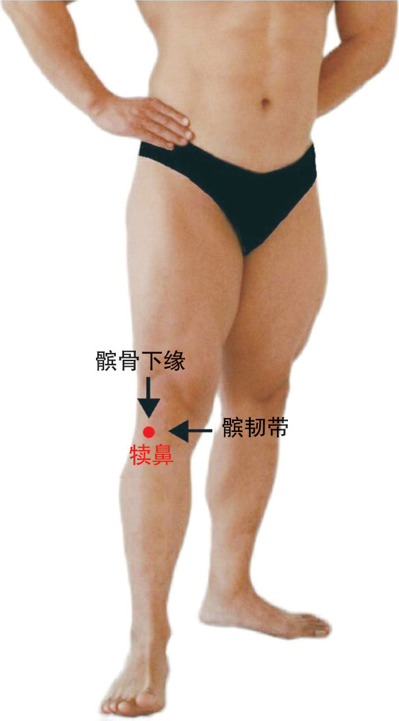 正坐或仰卧位点穴,屈膝,以髌骨下缘和髌韧带为定位标志。髌骨为膝关节前方皮下三角形的扁平骨,屈伸膝关节时随之移动,易于触及。髌韧带位于膝关节前面,是股四头肌腱向下的延续部分,附着于髌骨底及两侧缘,当股四头肌用力时,髌韧带被拉紧,此时容易在髌尖和胫骨粗隆之间触及,髌韧带两侧的凹陷明显显现,穴在外侧凹陷中。(图5-43)