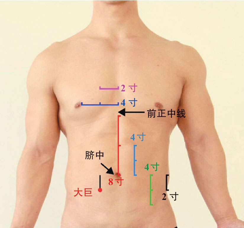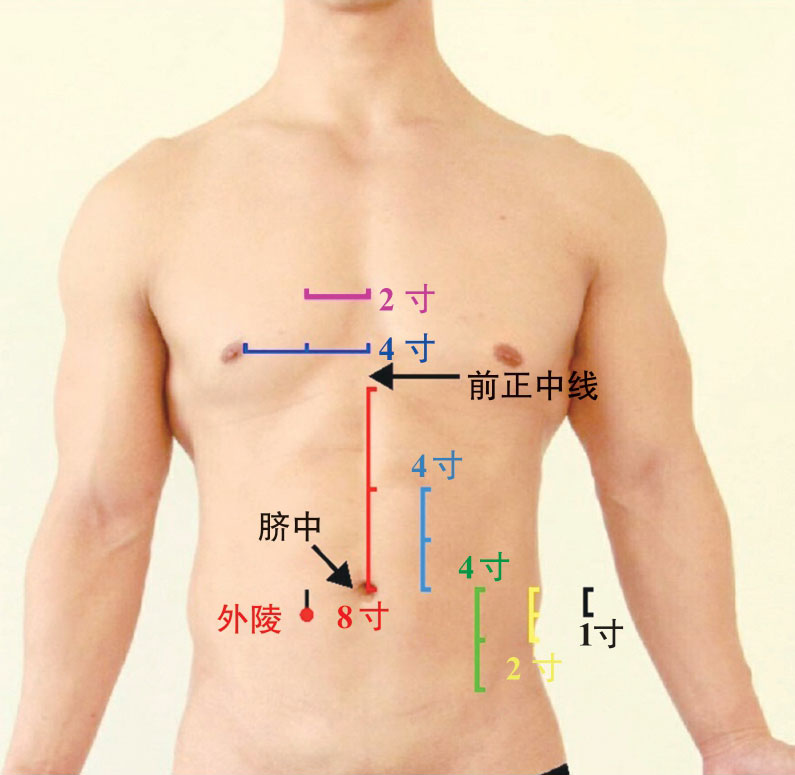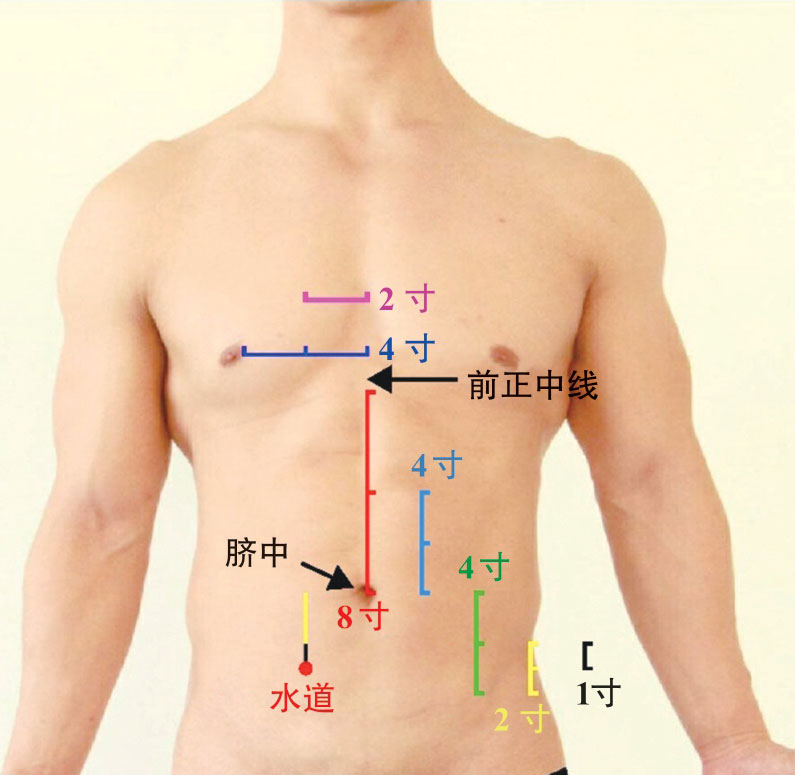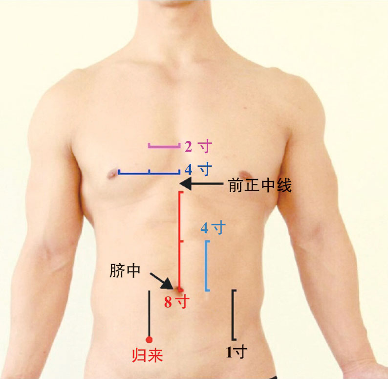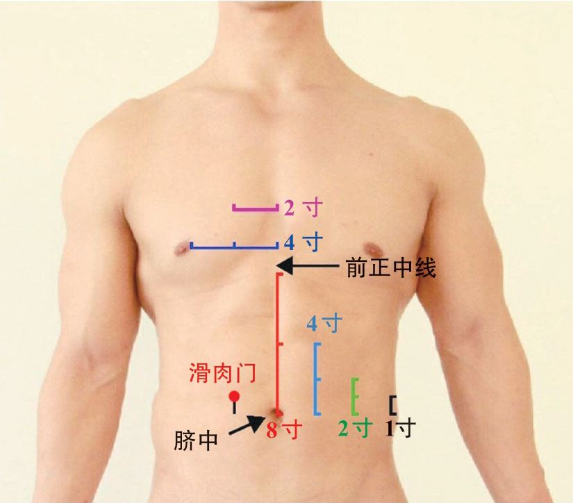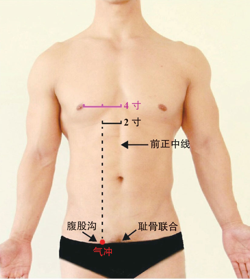 仰卧位点穴,以腹股沟、耻骨联合和前正中线为定位标志。腹股沟是连接腹部和大腿的斜行凹沟,体表易于触及。耻骨联合是位于下腹部正中的横行骨性标志,皮下易于触及。此处前正中线旁开2寸以前正中线到乳晕内缘的横寸值为量取标准。先将前正中线至乳晕内缘的4寸平均分成2段,每段2寸;再将此2寸自前正中线沿耻骨联合上缘水平平移,终点即为本穴。(图5-36)