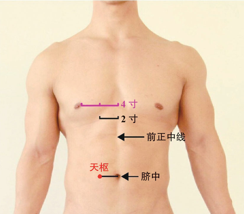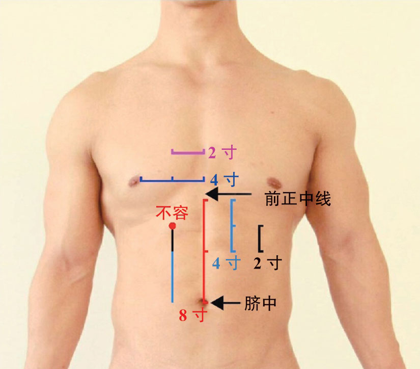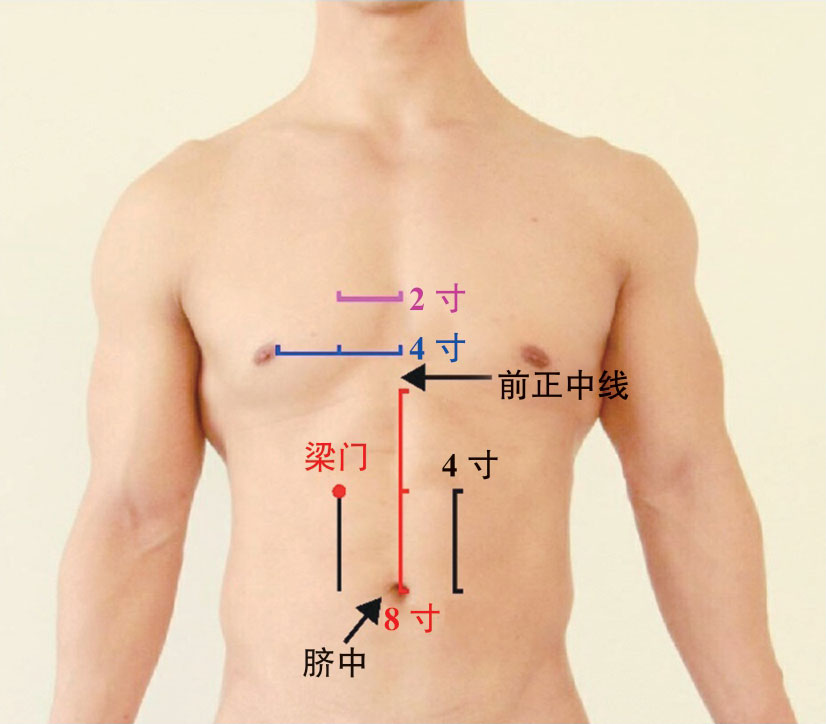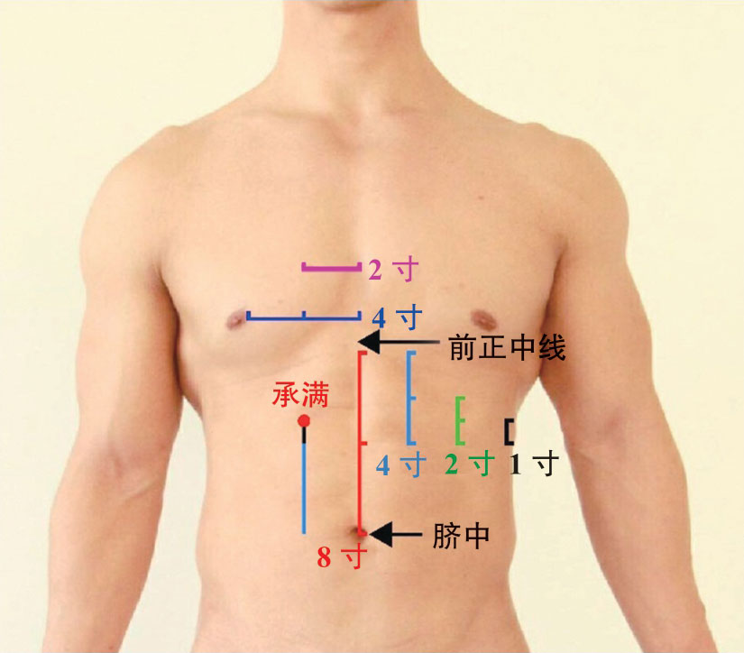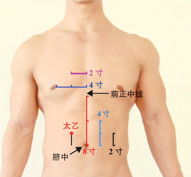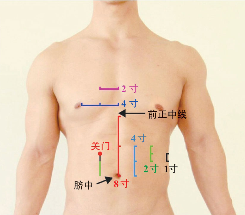 仰卧位点穴,以腹股沟、耻骨联合和前正中线为定位标志。腹股沟是连接腹部和大腿的斜行凹沟,体表易于触及。耻骨联合是位于下腹部正中的横行骨性标志,皮下易于触及。此处前正中线旁开2寸以前正中线到乳晕内缘的横寸值为量取标准。先将前正中线至乳晕内缘的4寸平均分成2段,每段2寸;再将此2寸自前正中线沿耻骨联合上缘水平平移,终点即为本穴。(图5-36)