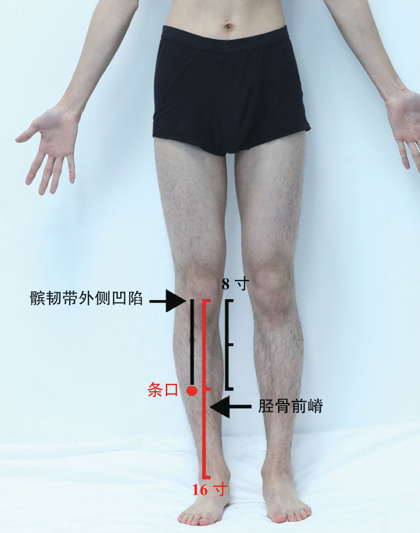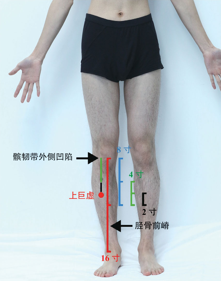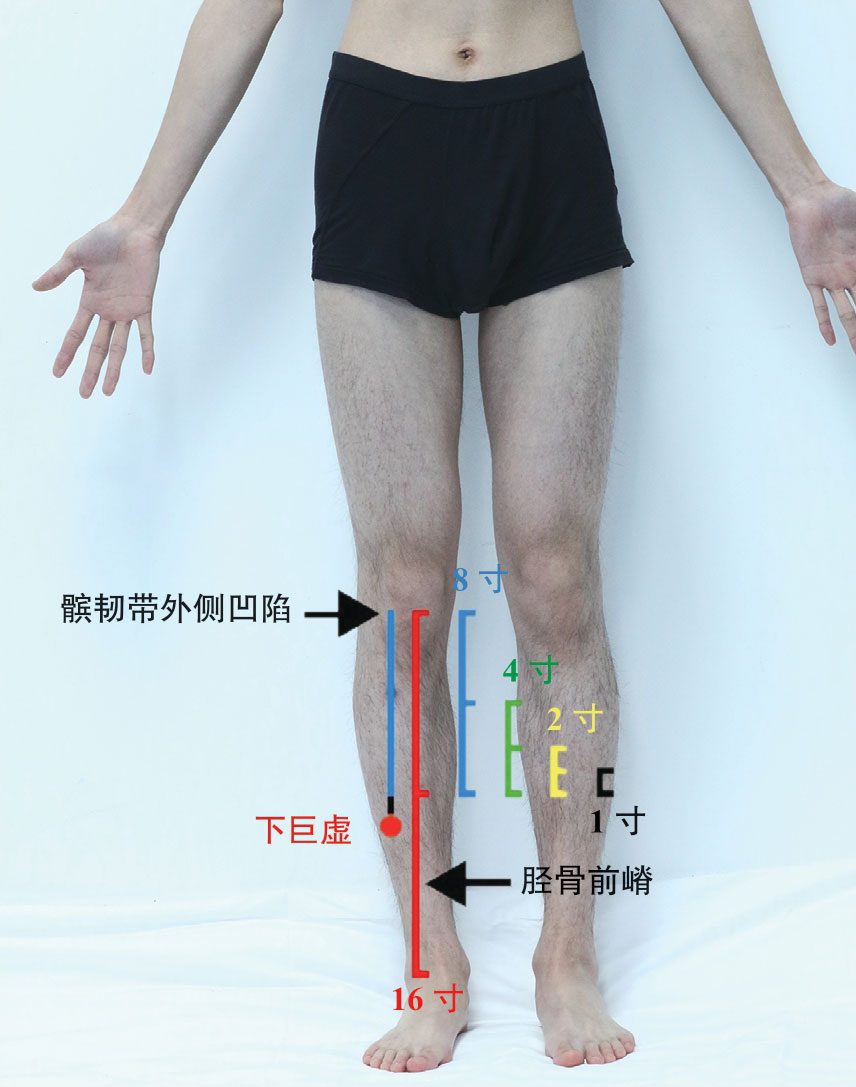 正坐或仰卧位点穴,以髌韧带外侧凹陷和胫骨前嵴为定位标志。髌韧带位于髌尖正下方,内外两侧各有一明显凹陷,下肢屈膝90°时,此凹陷易于显现。胫骨前嵴为胫骨前缘,在皮下易于触及,形似嵴状,穴在胫骨前嵴外一横指。此处髌韧带外侧凹陷下9寸以髌尖到外踝尖的直寸值为量取标准。先将髌尖至外踝尖之16寸平均分为2段,每段8寸;再将下段8寸平均分成2段,每段4寸;接着将上段4寸平均分成2段,每段2寸;最后将上段2寸平均分成2段,每段1寸,上下两段交界处即为髌韧带外侧凹陷下9寸。(图5-48)